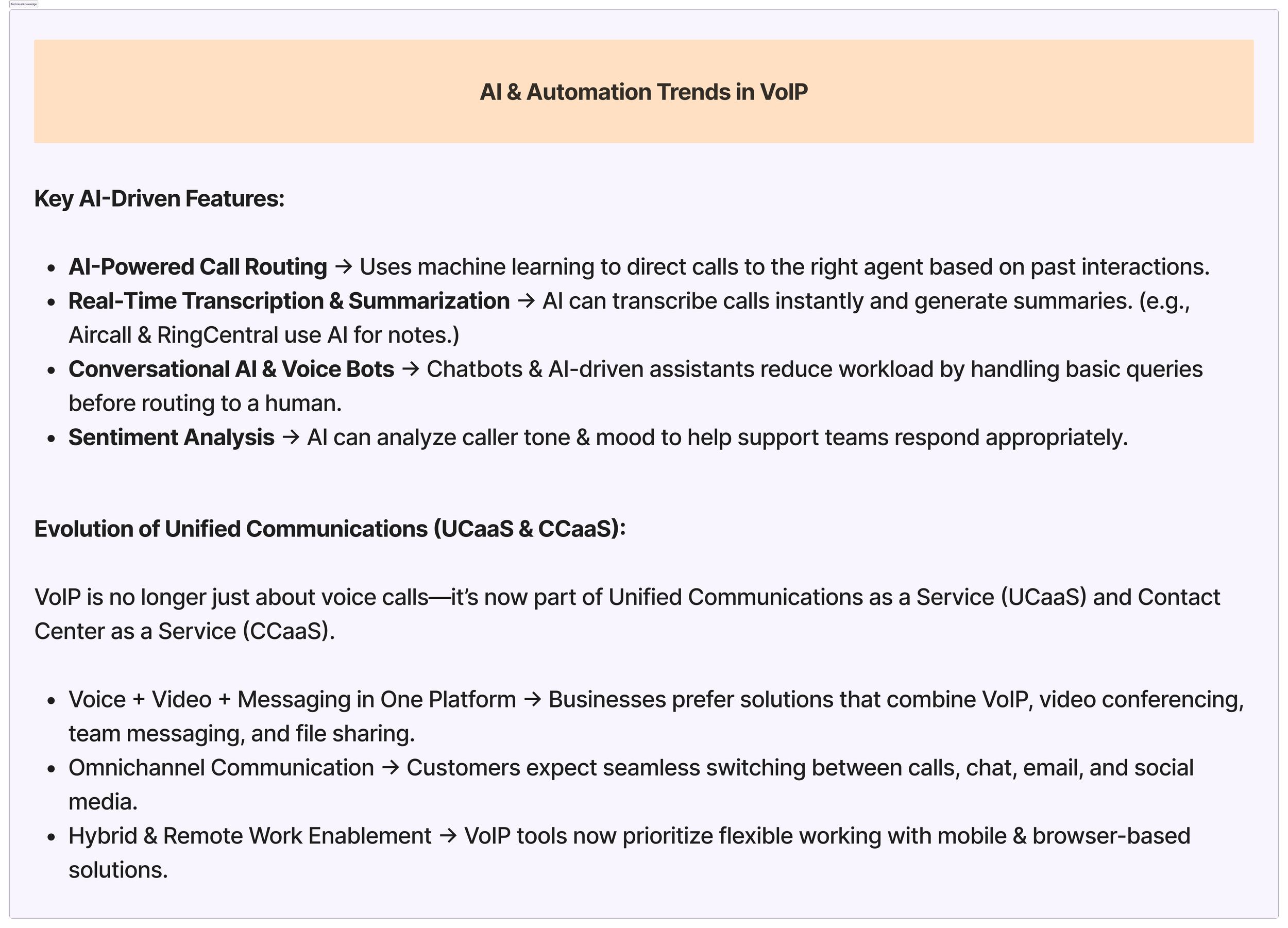 Based on my research into both direct and indirect competitors—as well as emerging trends in the VoIP space—I provided strategic recommendations for AI-powered features that could elevate the product’s capabilities and give the company a competitive edge.
